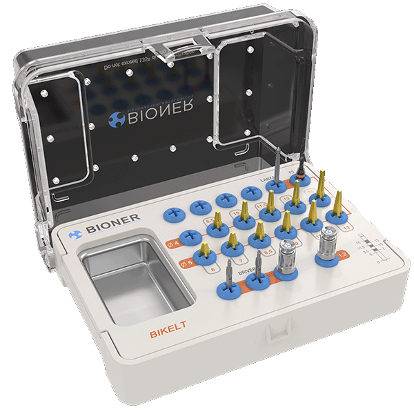 La peculiar morfología del implante BIKELT exige un sistema de fresado particular. El kit quirúrgico se compone de una fresa cilíndrica común a todas las referencias y una fresa específica para cada referencia que replica su geometría y garantiza un ajuste perfecto.